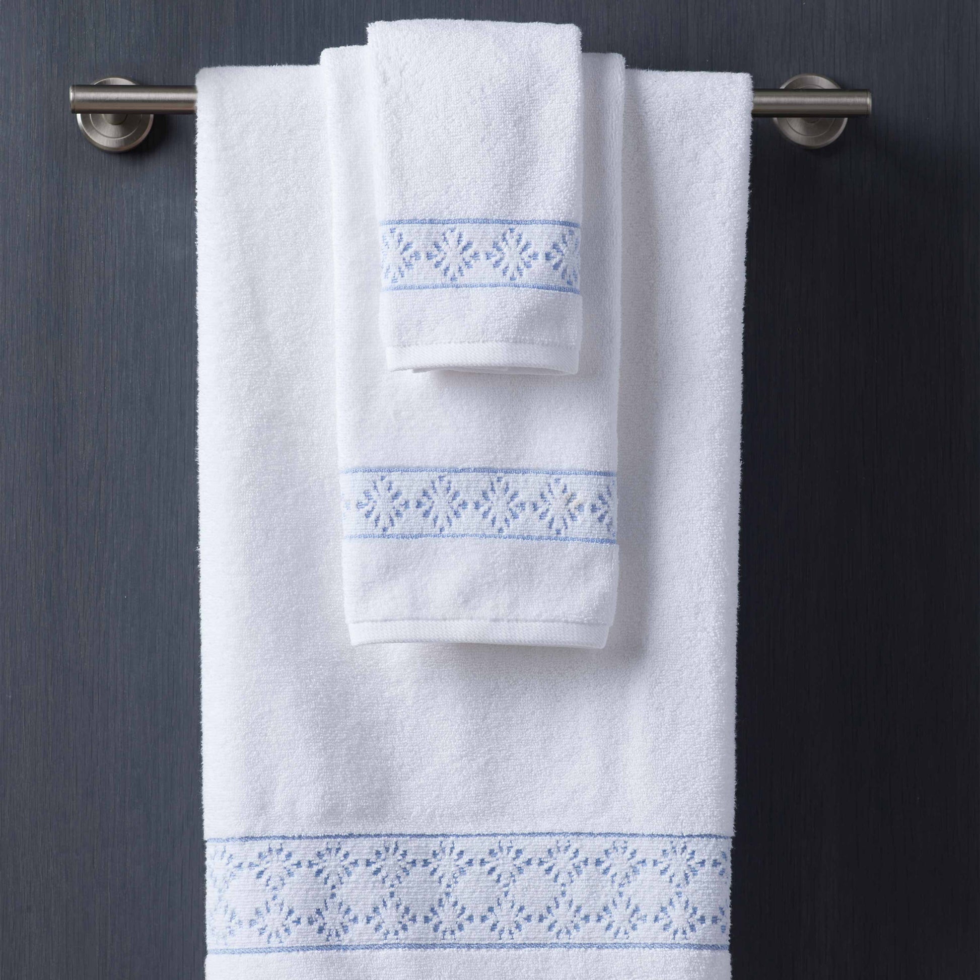 Our Savoy bath towels are reversible with a geometric jacquard border to add a touch of elegance. Pure, gentle, and sustainable. Our 100% Supima™ cotton towels are crafted for the most sensitive skin, offering natural softness and absorbency while coordinating with the bath rug collection.